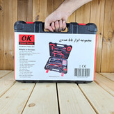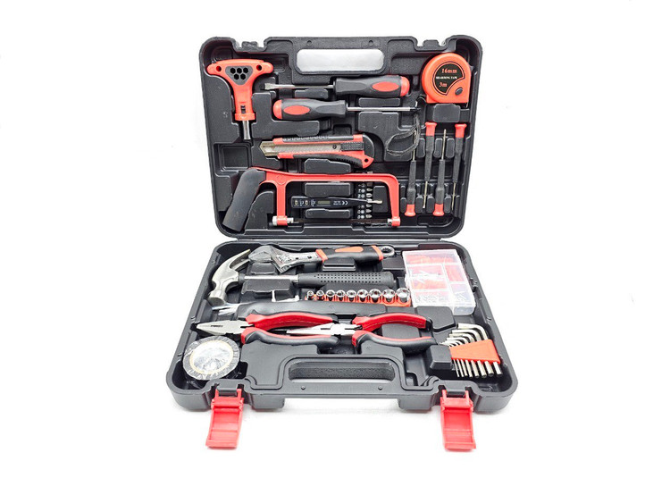 آچار فرانسه، انبردست، دمباریک، چکش با میخکش، مجموعه هشت عددی آچار آلن، کاتر سایز بزرگ روکش دار، بکس تک سایز ۴ تا ۱۳، متر ۳ متری روکش دار، پیچ گوشتی دوسو و چهارسو سایز بزرگ، چهار عدد پیچ گوشتی سایز ریز دو سو و چهار سو، دسته پیچ گوشتی T نوک خور بکسی، ۹ عدد نوک پیچ گوشتی، تبدیل نوک پیچ گوشتی به بکس چسب برق، فازمتر دیجیتال، دو سایز پیچ گوشتی موبایلی دو سو و دو سایز پیچ گوشتی موبایلی چهارسو، کمان اره چوب و فلز، مجموعه سایزبندی پیچ و رولپلاک، بست کمربندی