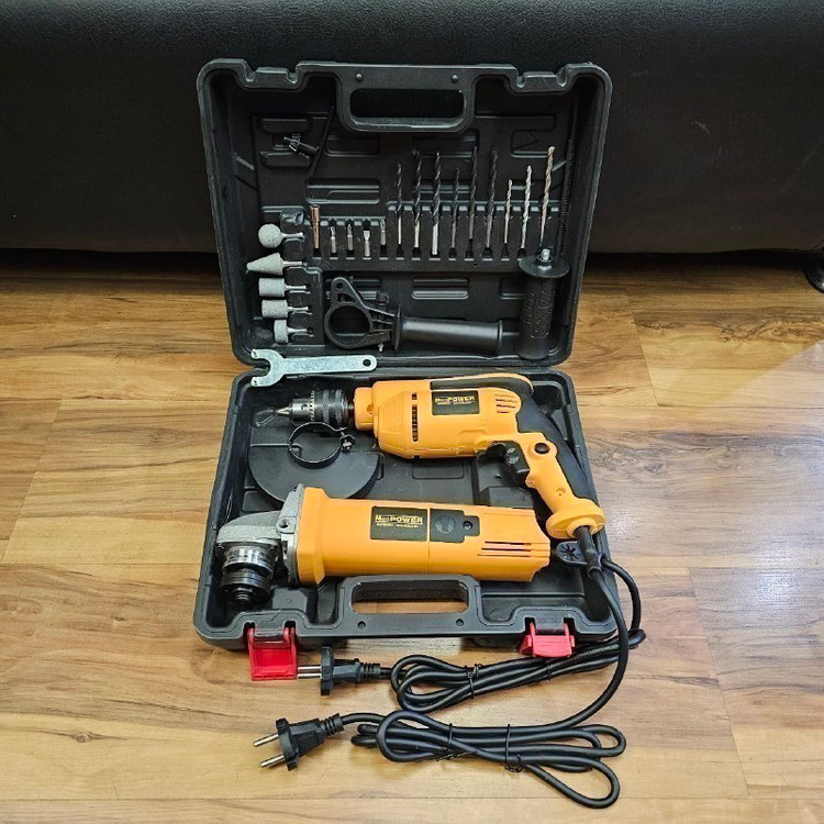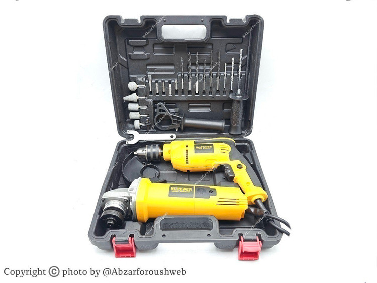 مشخصات دری:۱۰۰۰وات.چکشی..دیمر دار.سه نظام. مشخصات مینی فرز:۱۲۰۰وات.کیفیت عالی.صفحه۱۱۵میلیمتر. به همراه کیف حمل.مته دیوار.مته آهن و مته چوب هرکدام سایز های ۴تا۶.دسته دریل.دسته فرز.آچار دریل آچار فرز: ۱۰۰۰و۱۲۰۰وات